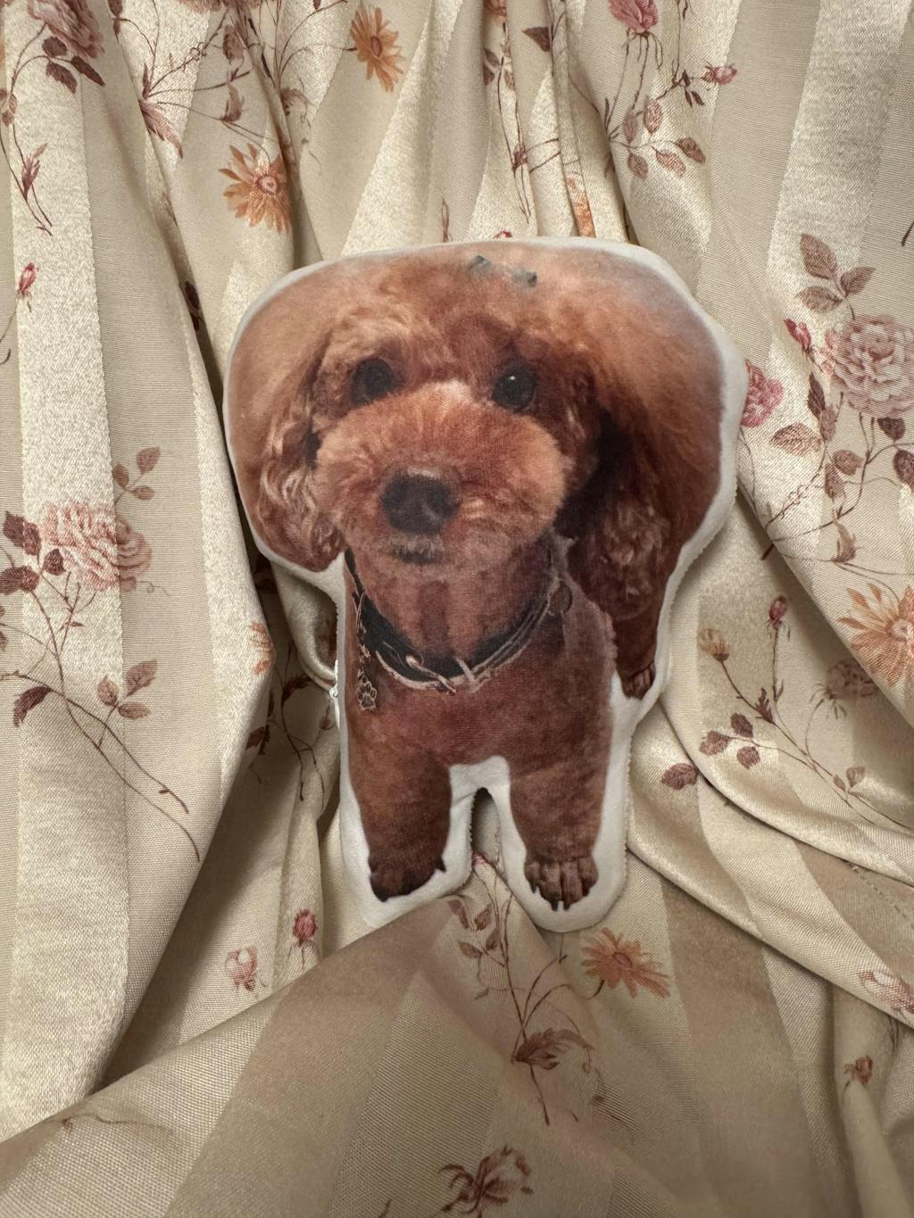 お送りいただいたペットの写真に色調補正をかけ、お顔や体に沿って丁寧に切り抜いた後、ご指定カラーでフチを作り、クッション生地に印刷します。